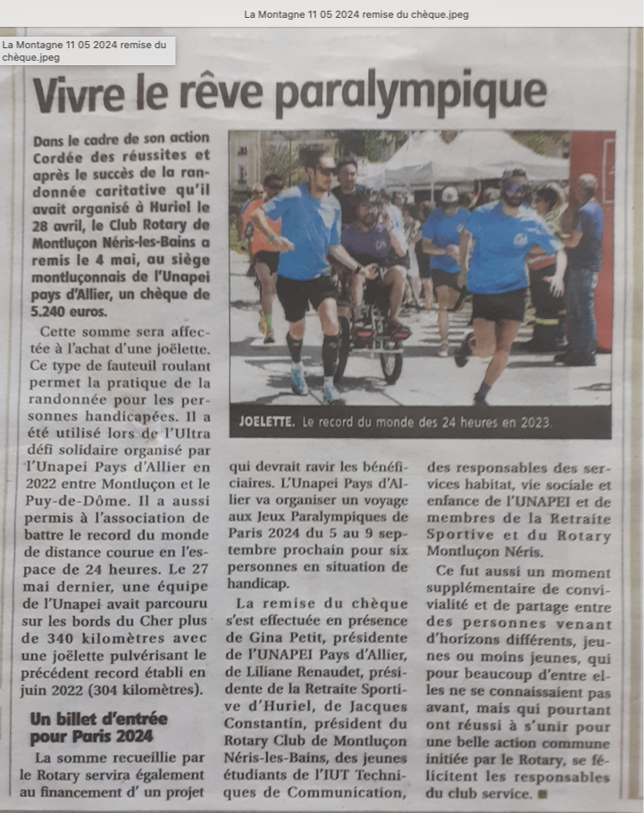 Chèque de 5 240 € destiné à la fourniture de la joëlette et des déplacements des 6 personnes handicapés aux Jeux Paralympiques
